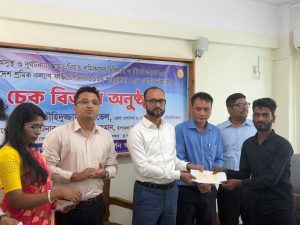 অসুস্থ, দুর্ঘটনায় আহত ও নিহত, শ্রমিকদের চিকিৎসা ও শিক্ষা সহায়তা প্রদানের লক্ষ্যে বাংলাদেশ শ্রমিক কল্যাণ ফাউন্ডেশনের অনুদানের চেক বিতরণ অনুষ্ঠান অনুষ্ঠিত হয়েছে।