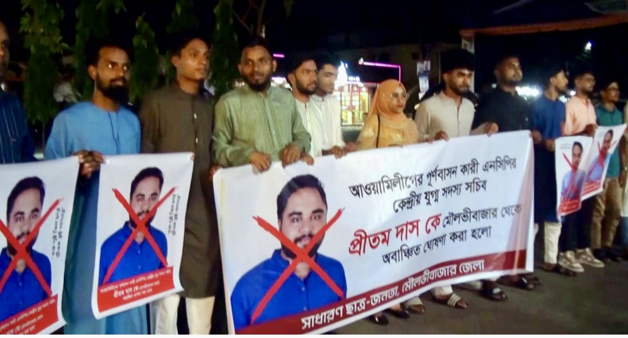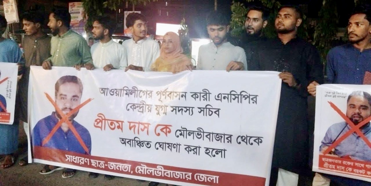 শুক্রবার (২০ জুন) রাত ১০টায় মৌলভীবাজার প্রেসক্লাব প্রাঙ্গণে কমিটি প্রত্যাখান ও আওয়ামীলীগ পুনর্বাসনের দায়ে এনসিপি’র কেন্দ্রীয় যুগ্ন সদস্য সচিব প্রীতম দাসকে মৌলভীবাজারে অবাঞ্চিত ঘোষণা করে বিক্ষোভ মিছিল করেন সাধারণ ছাত্র-জনতা। এ সময় বৈষম্যবিরোধী ছাত্র আন্দোলনের নেতৃবৃন্দরাও উপস্থিত ছিলেন। বিক্ষোভ মিছিলে প্রীতম দাসের বিরুদ্ধে এনসিপি’র আড়ালে আওয়ামীলীগ পুনর্বাসন ও জুলাই বিপ্লবের চেতনার সাথে বিশ্বাসঘাতকতার অভিযোগ তুলে বক্তব্য রাখেন সাধারণ ছাত্ররা।