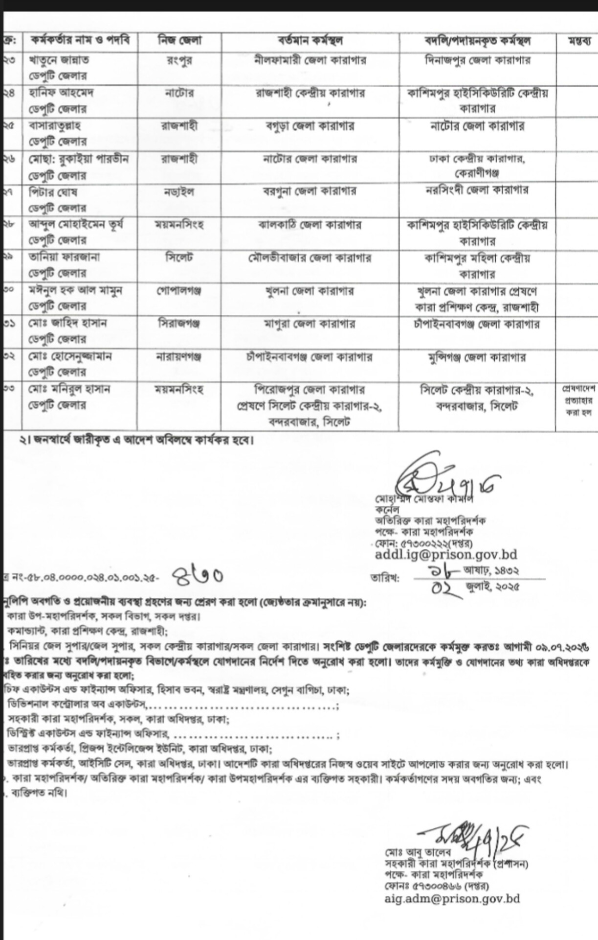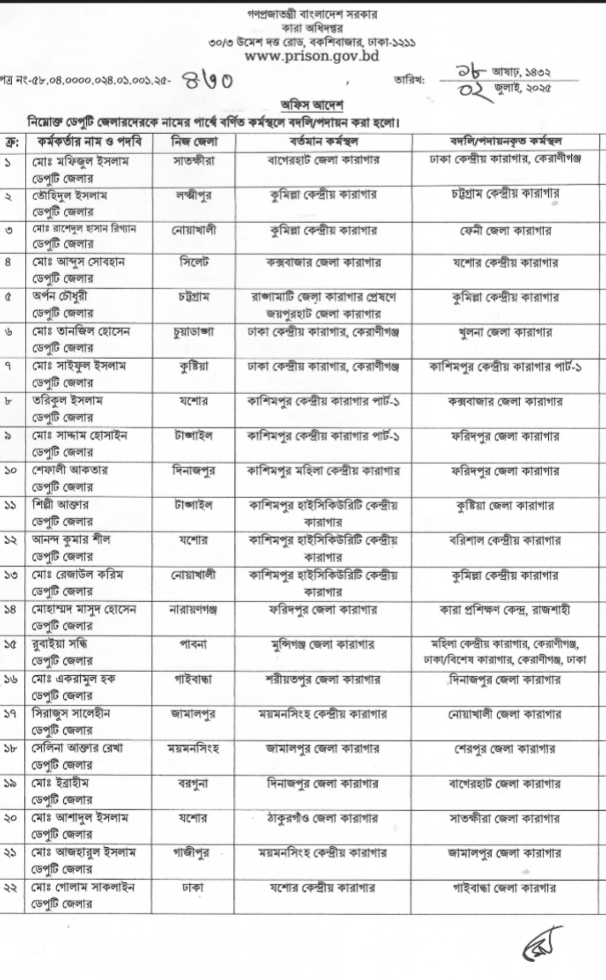 কারা অধিদপ্তরের ৩৩ ডেপুটি জেলারকে একযোগে বদলি করা হয়েছে। বুধবার (২ জুলাই) অতিরিক্ত কারা মহাপরিদর্শক কর্নেল মোস্তফা কামাল স্বাক্ষরিত এক অফিস আদেশে তাদের বদলি করা হয়।