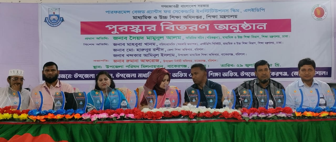 বরিশালের বাকেরগঞ্জে পারফরম্যান্স বেজড গ্র্যান্টস ফর সেকেন্ডারি ইনস্টিটিউশনস স্কিম, এসইডিপি মাধ্যমিক ও উচ্চ শিক্ষা অধিদপ্তর, শিক্ষা মন্ত্রণালয় এর পুরস্কার বিতরণ অনুষ্ঠান অনুষ্ঠিত হয়েছে।