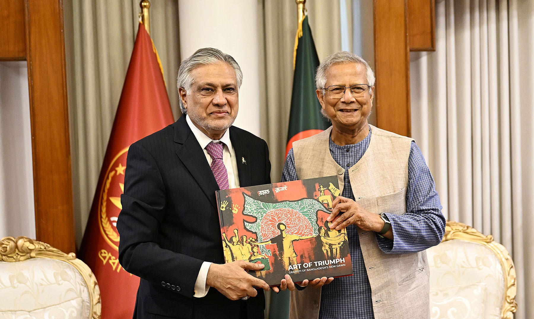 পাকিস্তানের উপ-প্রধানমন্ত্রী ইসহাক দারকে জুলাই অভ্যুত্থান নিয়ে বিশেষ বই উপহার দেন প্রধান উপদেষ্টা অধ্যাপক মুহাম্মদ ইউনূস। ছবি: সংগৃহীত।