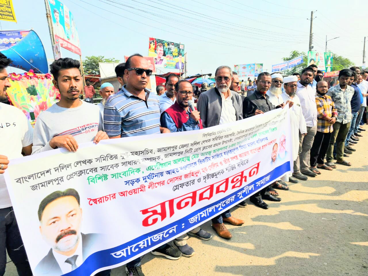 বৃহস্পতিবার (৪ ডিসেম্বর) দুপুরে জামালপুর প্রেসক্লাবের সভাপতি হাফিজ রায়হান সাদা’র সভাপতিত্বে ও দৈনিক জামালপুর দিনকাল পত্রিকার প্রধান সম্পাদক সৈয়দ মুনিরুল হক নোবেলের সঞ্চালনায় জামালপুর শহরের ফৌজদারি মোড়ে বেলা১২টায় অনুষ্ঠিত মানববন্ধনে বক্তব্য রাখেন বাংলাদেশ দলিল লেখক সমিতি জেলা শাখার সাধারণ সম্পাদক মো. হানিফ উদ্দিন, সদস্য আরিফ আকন্দ, জেলা প্রেসক্লাবের সভাপতি ফজলে এলাহী মাকাম, দৈনিক জামালপুর দিনকাল পত্রিকার সম্পাদক সাইদ পারভেজ তুহিন, সদর উপজেলা দলিল লেখক সমিতির কোষাধ্যক্ষ ইকবাল আকন্দ, বাংলাদেশ কংগ্রেস জেলা শাখার আহবায়ক আবু সায়েম মোহাম্মদ সা’-আদাত উল করীম, দৈনিক জামালপুর দিনকাল পত্রিকার বার্তা সম্পাদক মাহমুদুল হাসান মুক্তা প্রমুখ।
