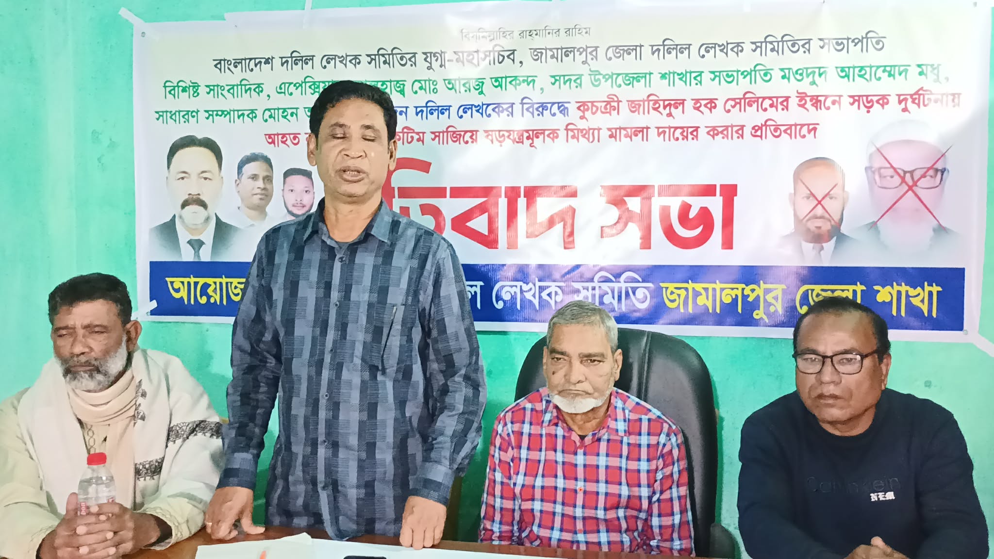 দৈনিক জামালপুর দিনকাল পত্রিকার প্রকাশক আলহাজ্ব মো. আরজু আকন্দসহ ৮ জনের বিরুদ্ধে ষড়যন্ত্রমূলক মিথ্যা মামলা বাতিলের দাবিতে শহরের কথাকলি মার্কেটে সমিতির অস্হায়ী কার্যালয়ে এক প্রতিবাদ সভা অনুষ্ঠিত হয়েছে। একই সঙ্গে ‘স্বৈরাচার আওয়ামী লীগের দোসর’ জাহিদুল হক সেলিম ও তার সশস্ত্র ক্যাডার রাশেদুল হাসান নওশাদের দৃষ্টান্তমূলক শাস্তিরও দাবি জানিয়েছেন বাংলাদেশ দলিল লেখক সমিতি জামালপুর জেলা শাখা।